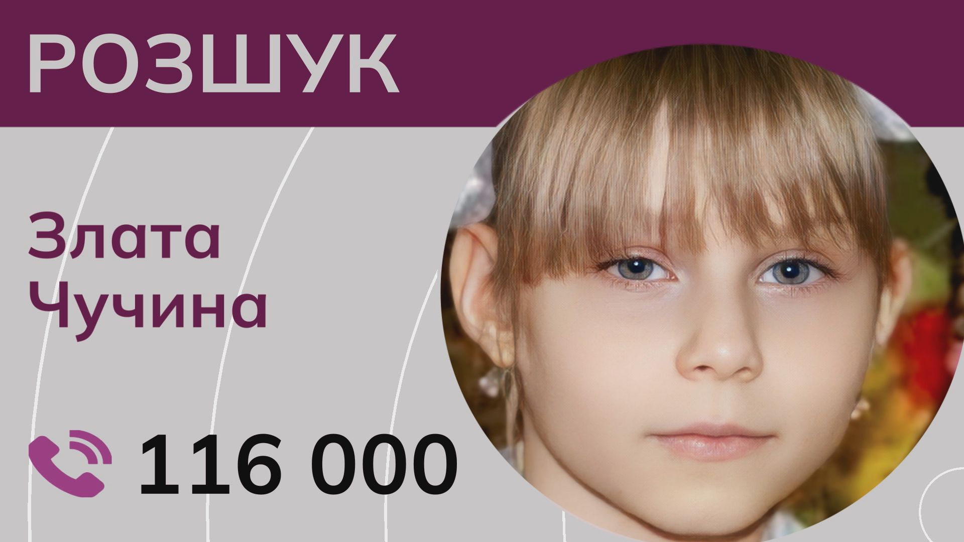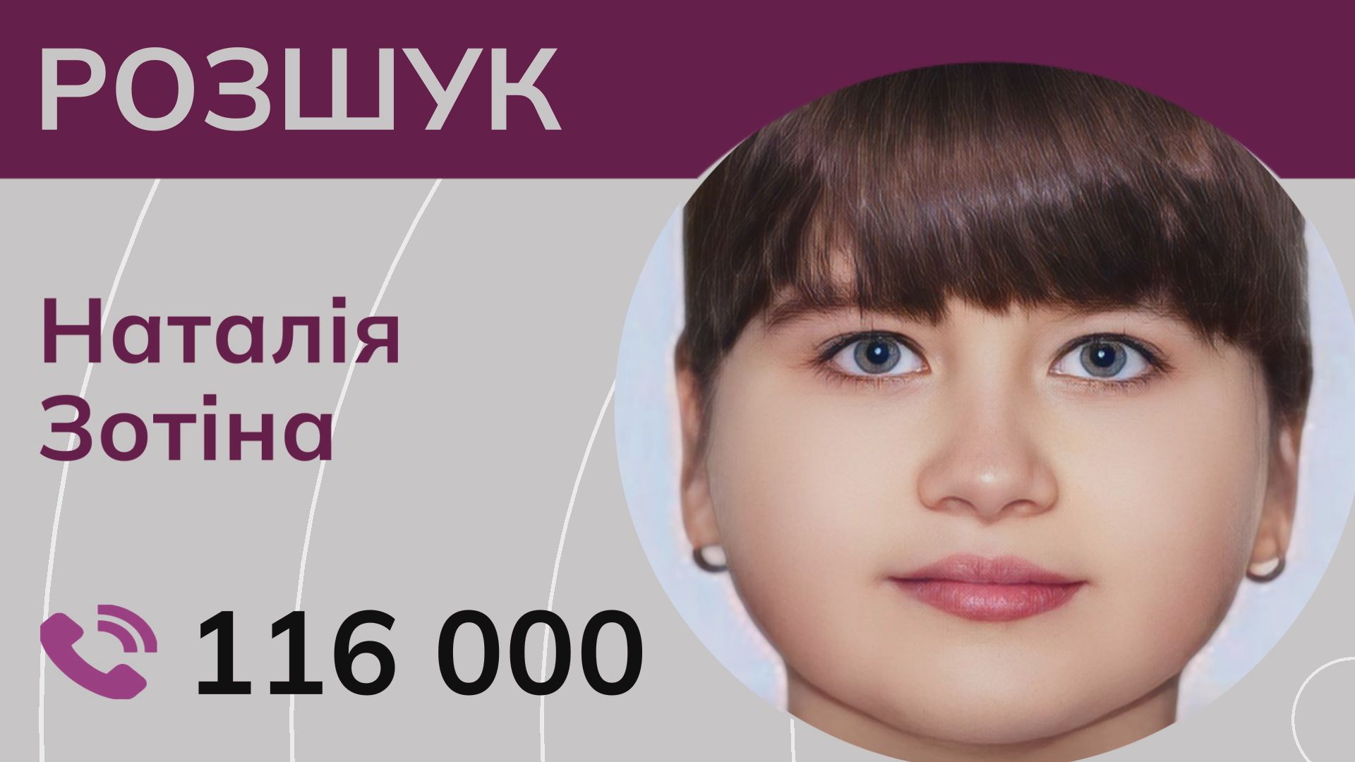 Ми розшукуємо одинадцятирічну Наталю Зотіну, яка зникла у квітні 2024 року в селі Семигір’я, Донецької області. Відтоді про дівчинку не надходило жодної звістки. У вересні Наталі має виповнитися дванадцять років. У неї кругле обличчя, темне волосся та блакитні очі.